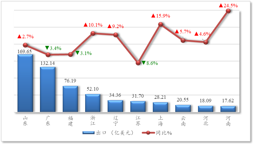 2025年前9个月,国内前十位省市农产品出口额合计580.6亿美元,比上年同期增长2%,占农产品出口总额77.9%。山东、广东、福建三省合计占比超过50%,其中,山东同比增长2.7%,而广东和福建则分别下降3.4%和3.1%。河南在前十位省市中增速最高达到24.5%,上海、浙江和辽宁的增速均超过9%。