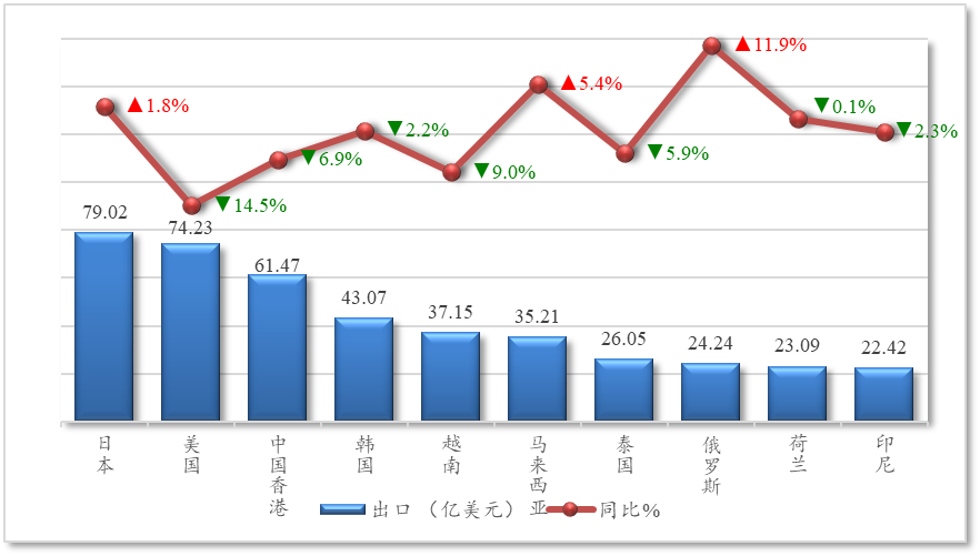 2025年前9个月,我国农产品前十位出口市场出口额合计426亿美元,比上年同期下降4.1%,占我农产品出口总额57.2%。日本以10.6%的占比稳居我农产品出口市场首位,同比增长1.8%,是前三大市场中唯一实现正增长的国别地区。分居二、三位的美国与中国香港出口额同比分别下降14.5%和6.9%,是拉低整体出口增速的主要因素,韩国、越南、泰国、印度尼西亚等亚洲周边市场也出现不同幅度下降。而马来西亚和俄罗斯仍显示出较为强劲的增长势头,出口额同比分别增长5.4%和11.9%。荷兰微降0.1%。