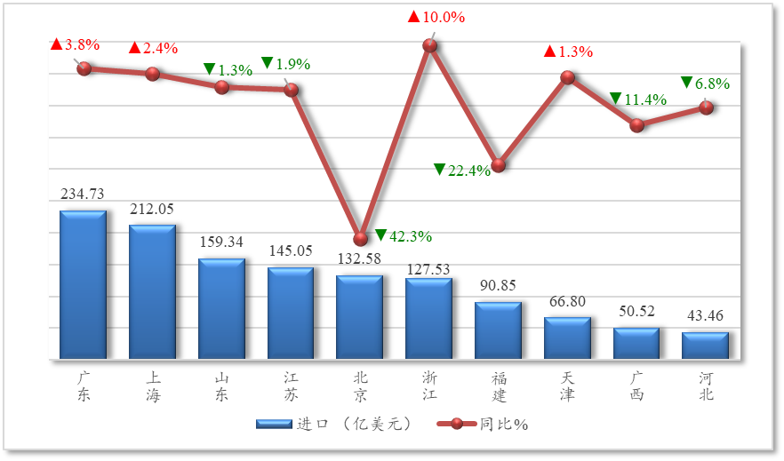 2025年前9个月,国内前十位省市农产品进口额合计1,262.9亿美元,比上年同期下降8.2%,占农产品出口总额81.2%。广东、上海稳居省市前列,占比分别为15.1%和13.6%,且均保持正增长;山东、江苏虽位列三、四位,但进口额同比仍有小幅下降。浙江同比增长10%,在前十大省市中增速最高;天津也实现1.3%的温和增长。相比之下,北京、福建进口仍大幅下降,广西、河北也呈现不同程度下降。