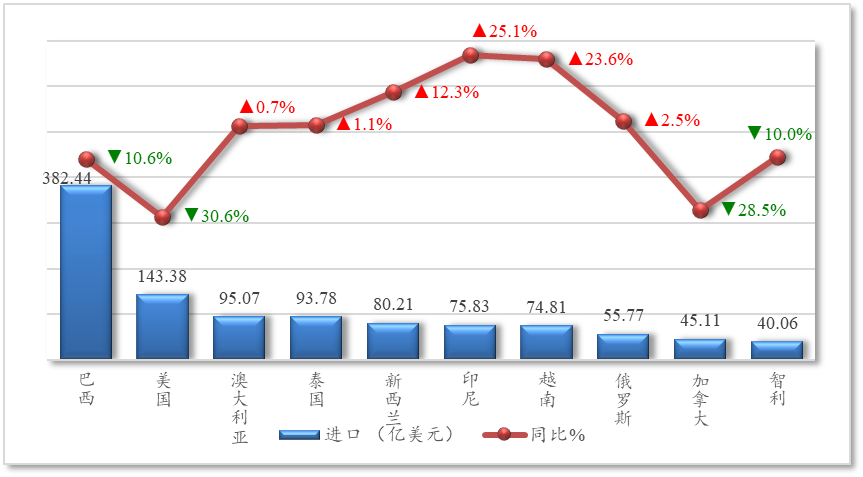 2025年前9个月,我国农产品前十大进口市场进口额合计1,086.45亿美元,比上年同期下降7.7%,占农产品进口总额69.8%。巴西作为我农产品首要进口来源国,尽管进口额同比仍下降10.6%,但降幅较前期已明显收窄,且占比也提升至24.6%。而美国进口占比则降至9.2%,同比下降30.6%,降幅进一步加深。加拿大与智利的进口额依然大幅下降。与此同时,印尼、越南和新西兰继续保持强劲增速,俄罗斯、泰国和澳大利亚增速也较为稳定。