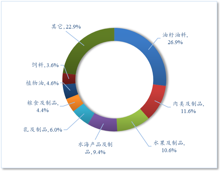 前9个月,油籽油料在我农产品进口中占据主导地位,占比达26.9%,但进口额同比下降9.7%;乳品、水海产品和植物油进口增长显著,是我农产品进口的重要组成部分;肉类和水果进口增长较为平稳,增幅均在4.8%左右。粮食及制品、饲料进口额降幅明显,同比分别下降51.9%和12.2%。