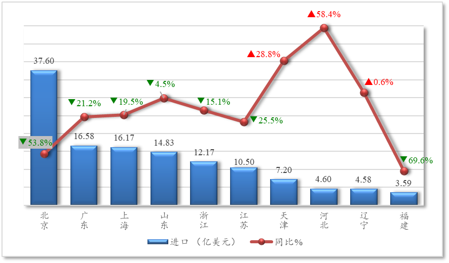 前9个月,北京、广东、上海作为前三大进口省市,合计占比近五成,进口额同比均下降19%以上,其中北京降幅显著,达53.8%。江苏、浙江、福建等地进口也普遍大幅下降,福建降幅更是接近70%。河北与天津实现逆势增长,辽宁也保持微增,在一定程度上缓解了全国进口的整体下行压力。