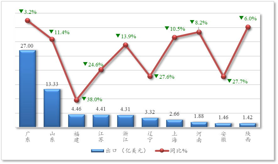 前9个月,前十大省市对美出口农产品合计占比超过85%,其中占比居前两位的广东、山东两省出口额均有下降;福建、江苏、辽宁、安徽降幅均超过24%;浙江、上海降幅在10%以上;河南、陕西出口降幅较为缓和。