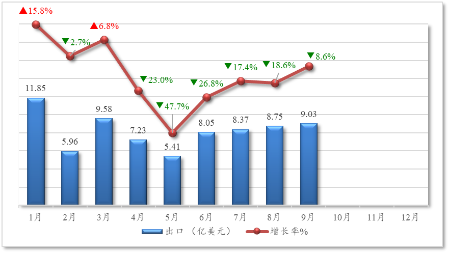 从月度走势看,出口在5月触底后呈现逐月回升态势,至9月当月出口额9亿美元,同比下降8.6%,降幅较前期明显收窄。进口方面,除2月实现24.6%的同比正增长外,其余月份均为负增长,4月、7月及9月降幅均超过48%,9月当月降幅进一步扩大至68.6%,进口持续深度低迷,未见好转迹象。