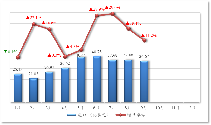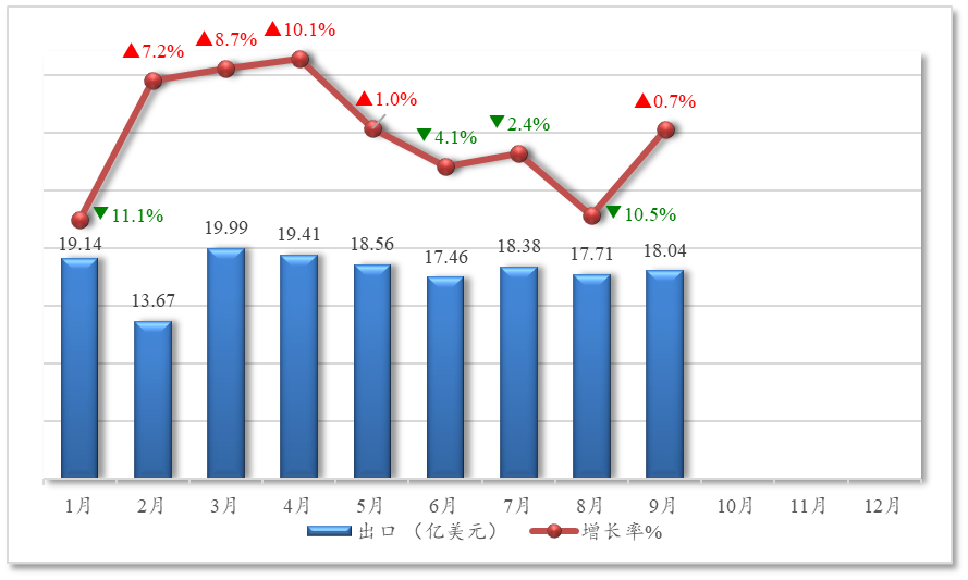 从各月走势看,出口额波动较为明显:1月、6月、7月、8月出现同比下降,尤其是1月和8月降幅较大,分别下降11.1%和10.5%;2月至5月各月及9月实现正增长,其中4月增幅最高达10.1%。进口方面则增长强劲,除1月微降、4月增幅较小外,其余月份均实现两位数高速增长,6月和7月增幅更是分别达到27.9%和29%。