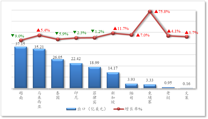 前三季度,东盟前五大出口市场合计占比超过85%,但除马来西亚同比增长5.4%,越南、泰国、印尼和菲律宾均有不同程度下降,尤其是越南,作为中国在东盟第一大农产品出口市场,同比下降9%,在东盟国家中降幅最高。而与此同时,对新加坡、缅甸、柬埔寨等份额较小的东盟国家出口增速显著,如柬埔寨虽然占比仅2%,但增速高达75.8%,新加坡占比8.7%,增速11.7%。