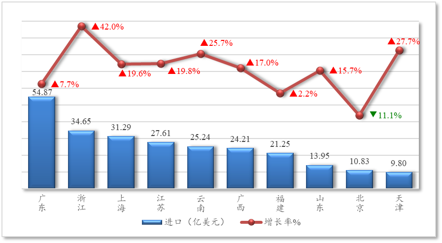 1-9月,自东盟进口农产品前十位省市中,除北京市同比下降11.1%外,其余省市均实现增长。广东、浙江、上海、江苏是进口主力大省(市),浙江省进口额同比高达42%,为前十位省市增速最高的省份。云南、广西、山东、天津四省市进口增速也均实现两位数增长,福建省同比增长2.2%,增速平稳。