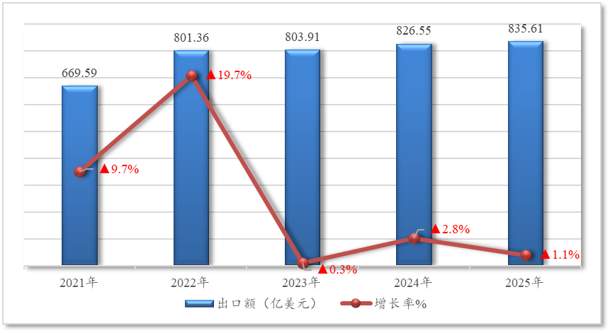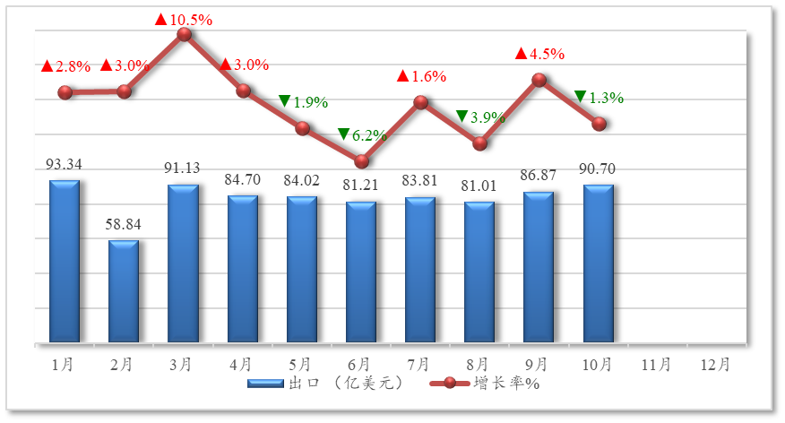 据海关统计,2025年1-10月,我国农产品出口总额达835.6亿美元,占全国外贸出口总额2.7%。累计出口额创近五年同期最高水平,较上年同期增长1.1%,整体延续小幅增长态势。10月当月出口额90.7亿美元,同比下降1.3%,较9月的正增长有所回落。