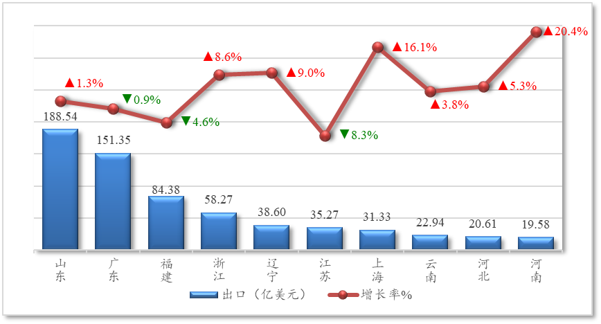 1-10月,国内农产品出口额排名前十位省市合计出口650.9亿美元,同比增长1.7%,占全国农产品出口总额的77.9%。其中,山东省以22.6%的占比位居首位,出口额同比增长1.3%;广东省和福建省分别以18.1%和10.1%的占比位列第二、第三位,但同比分别下降0.9%和4.6%。在增长方面来看,河南、上海、辽宁、浙江四省市出口增速较快,同比增长在8.6%至20.4%之间,尤其是河南省,虽占比仅为2.3%,却实现了超过20%的高速增长,在前十省市中增速最高。
