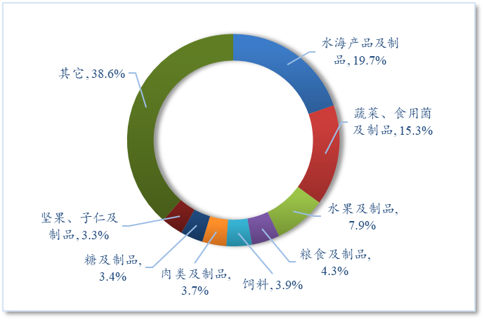 1-10月,水海产品及制品以19.7%的出口占比位居首位,同比增长2.1%,增长较为平稳;蔬菜、食用菌及制品出口占比15.3%,同比下降7.5%,增速持续回落。肉类及制品、坚果子仁及制品、粮食及制品增长显著,增速分别为16.7%、15.5%和10%。水果及制品、糖及制品分别小幅增长1.0%和3.1%,增速相对平稳。饲料出口额同比下降12.2%,在主要大类产品出口中降幅最大。