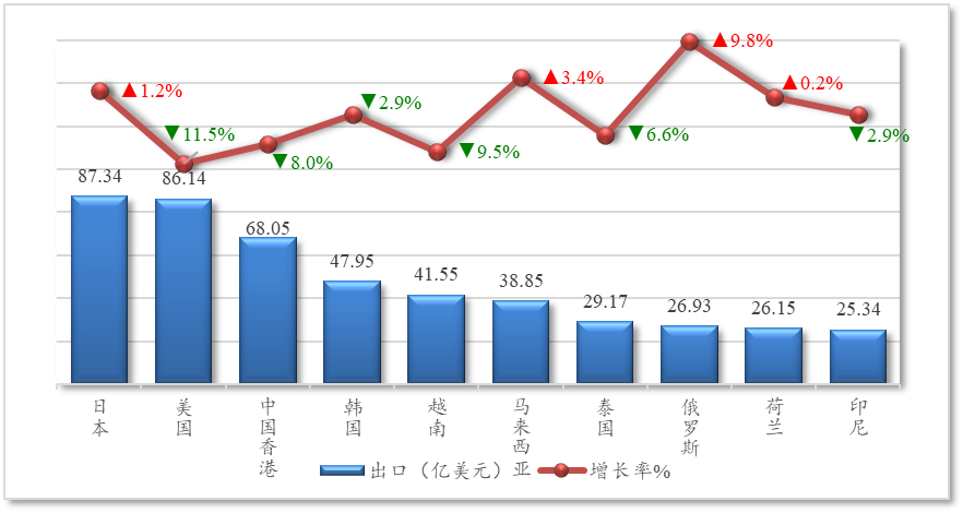 1-10月,我国农产品前十大出口市场合计出口额477.5亿美元,同比下降4.2%,占我农产品出口总额57.1%。其中,日本以10.5%的占比位列第一位,同比增长1.2%;美国占比10.3%位居第二位,同比下降11.5%,在前十大市场中降幅最高。中国香港、韩国、越南、泰国、印尼等市场出口均有所下降,降幅在2.9%至9.5%之间。俄罗斯和马来西亚分别增长9.8%和3.4%,是前十大市场中增长较为明显的地区;荷兰微增0.2%,表现相对平稳。