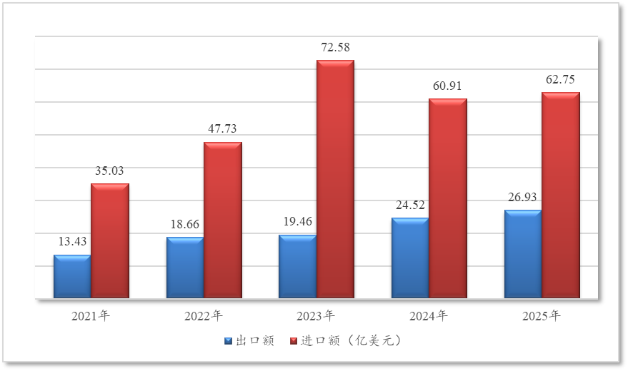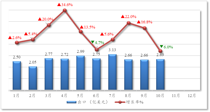 从月度走势看,出口波动较大:3月、4月、8月、9月出口额同比增幅均超过16%,其中4月高达34.6%;但6月、10月分别出现4.7%、6%的负增长。进口走势则呈现前低后高态势:1月、2月进口额同比分别下降25.5%和7.4%,自3月起恢复正增长,7月增速最高达17.1%,此后各月增速在0.4%至12.3%之间。
