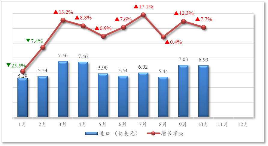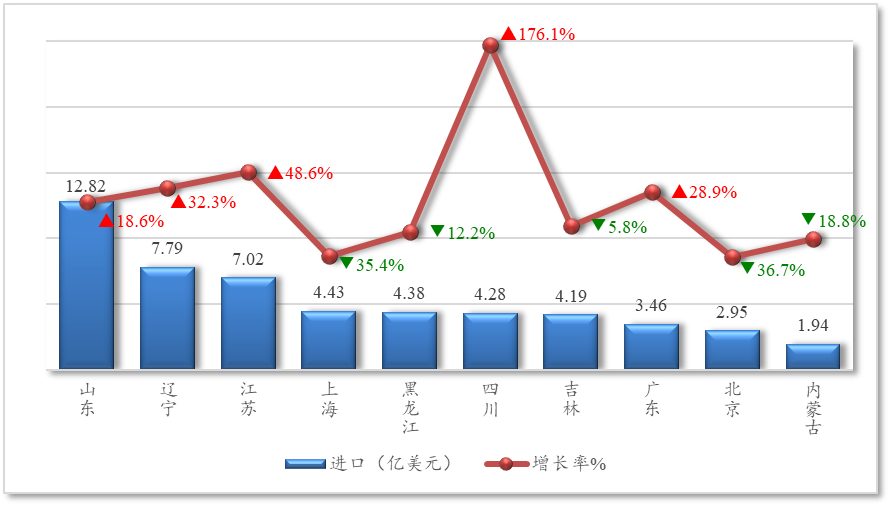1-10月,山东、辽宁和江苏进口额合计占比44%,同比分别增长18.6%、32.3%和48.6%,增长势头良好。四川省进口额同比大幅增长176.1%,增速遥遥领先,占比也提升至6.8%。广东省保持稳步增长,进口额同比增长28.9%,占比5.5%。与此同时,部分省市进口额下降,其中,上海、黑龙江、北京、内蒙古同比降幅在12.2%至36.7%之间,吉林省进口额同比小幅下降5.8%。