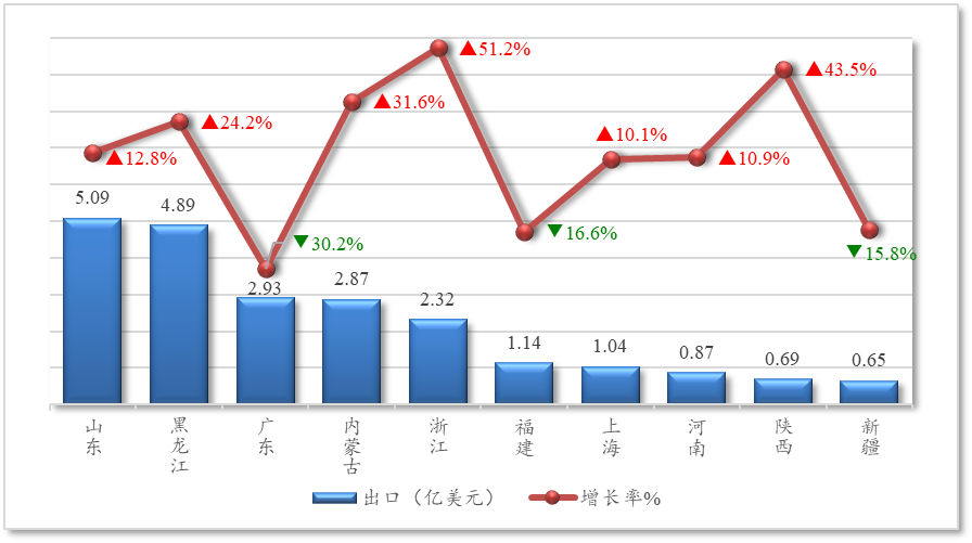 今年前10个月,山东和黑龙江作为最主要出口省份,出口额合计占比37%,同比分别增长12.8%和24.2%。广东省虽然占比10.9%,但同比大幅下降30.2%,在前十位省市中降幅最为明显。内蒙古、浙江、陕西增长势头强劲,其中,内蒙古占比10.6%、增长31.6%;浙江占比8.6%、增速高达51.2%,在前十位省市中增速最高;陕西虽然占比仅2.6%,但增幅也达到43.5%。此外,上海、河南出口额同比增速超过10%;福建和新疆出口额同比分别下降16.6%和15.8%。