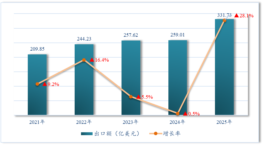 据Vietnam Customs1统计,2025年1-9月越南农产品出口总额331.7亿美元,较上年同期大幅增长28.1%。从近五年同期数据来看,越南农产品出口整体呈持续增长态势,本年度增幅尤为显著,出口规模创下同期历史新高。