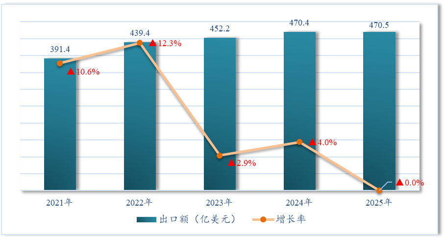 据Thai Customs Department统计,近五年,泰国农产品出口总体保持增长,出口额从2021年的391.4亿美元持续上升至2025年的470.5亿美元,五年累计增长约20%。但增速逐年放缓:2021-2022年增速分别达到10.6%和12.3%,为近五年高点;2023年增速骤降至2.9%,2024年小幅回升至4%,2025年则几近停滞,同比仅增长0.01%,出口动能明显减弱。