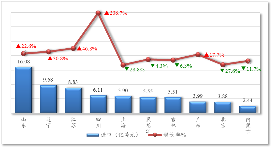 五、2025年,在自俄罗斯进口额排名前十位省市中,山东、辽宁、江苏前三位省市合计占比达43.2%,增速均超过22%;四川省增速高达208.7%,是增长势头最为强劲的省份