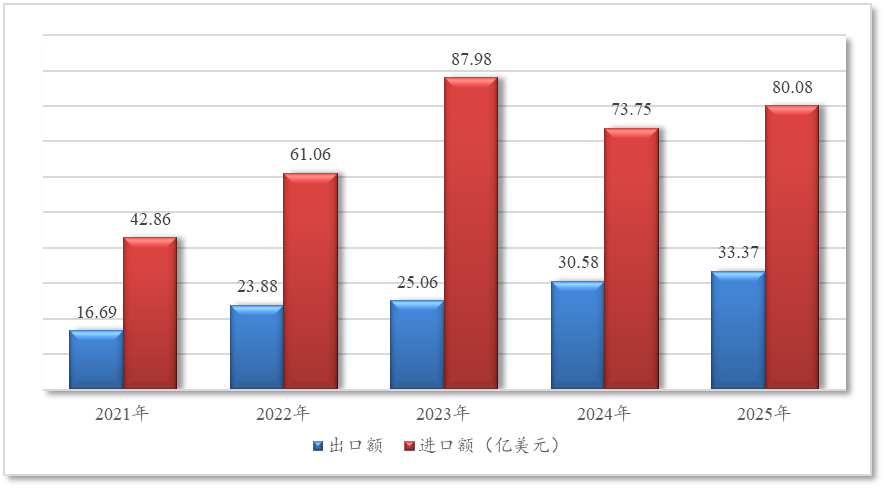 2025年,中国与俄罗斯农产品进出口总额113.5亿美元,比上年同期增长8.7%。其中,出口33.4亿美元,同比增长9.1%,占我农产品出口总额3.2%;进口80.1亿美元,同比增长8.6%,占我农产品进口总额3.9%,为近五年同期最高。目前,俄罗斯在中国农产品出口市场中排名第九位,进口市场中排名第八位。
