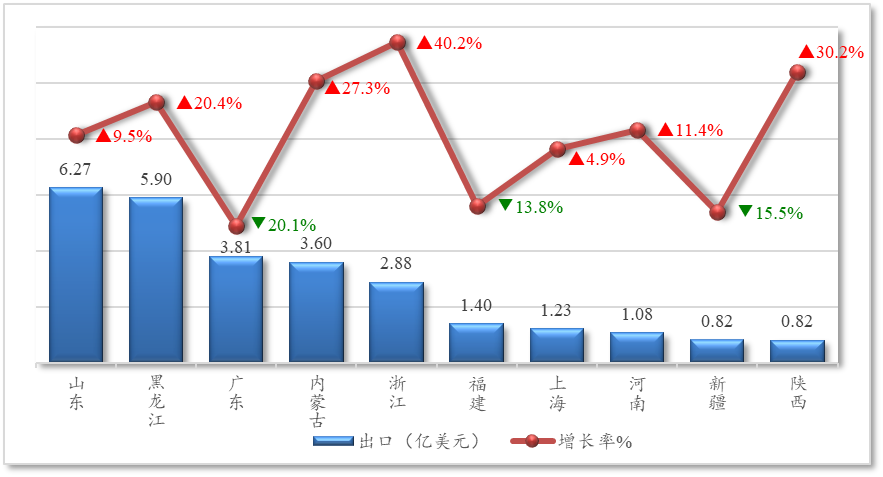 2025年,山东作为对俄出口农产品第一大省,出口额6.3亿美元,同比增长9.5%,占对俄农产品出口总额18.8%;黑龙江占比17.7%,增长20.4%,增速位居前列;广东占比11.4%,但同比下降20.1%,在前10位出口省市中降幅最大。浙江、陕西、内蒙古增长较快,同比分别增长40.2%、30.2%和27.3%;福建、新疆同比分别下降13.8%和15.5%。