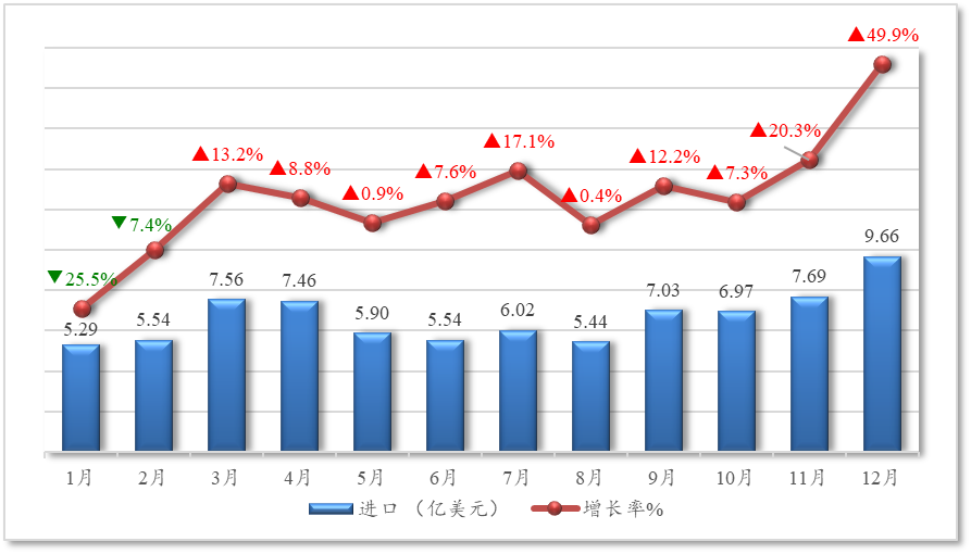 从月度走势看,出口同比增速波动较大。1月出口额同比增长仅2.5%,随后逐步回升,4月达到全年最高点34.6%,之后有所回落,6月和10月分别下降4.7%和6.1%,其余月份均保持正增长,年末两个月增速回升至4.6%和8.1%。进口方面,年初1月、2月进口额同比分别下降25.5%和7.4%,3月起转为正增长,此后逐步改善,增速总体向上,12月增速高达49.9%,为全年最高。