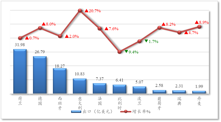 2025年,荷兰、德国和西班牙是我对欧盟农产品出口前三大市场,占比分别为25%、21%和14.3%,合计超过60%,出口额同比均有增长。对意大利、丹麦、葡萄牙、法国、瑞典等国别市场实现较快增长,其中,意大利出口额同比增长20.7%,在前十位市场中增速最高。而对比利时和波兰出口有所下滑,同比分别下降9.4%和1.7%。