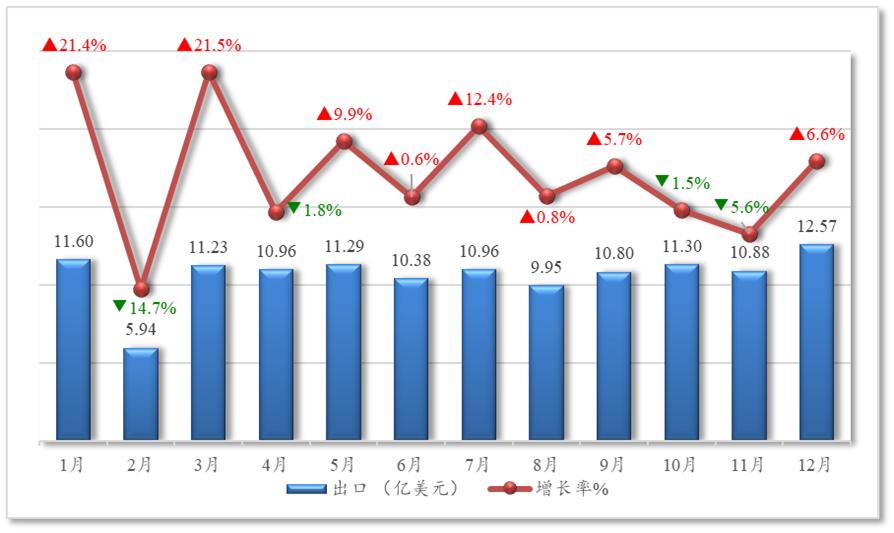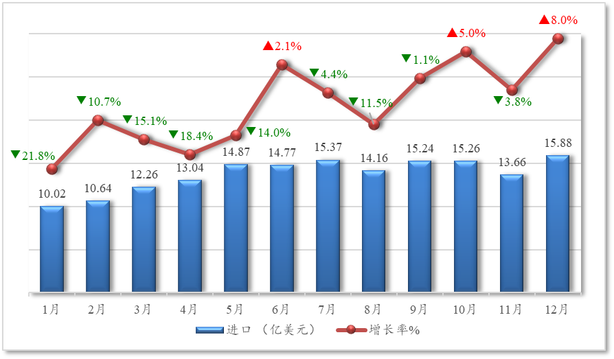 从月度走势看,出口额同比在1月和3月分别大幅增长21.4%和21.5%。2月、4月、10月、11月出现下降(其中2月降幅最大为14.7%),其余月份均保持小幅正增长。进口方面整体减弱,多数月份为负增长,其中1月同比降幅最大,达21.8%,全年仅6月、10月、12月进口额同比实现正增长,增幅分别为2.1%、5%和8 %。