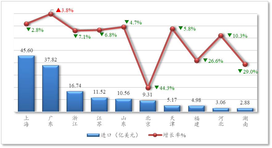 七、2025年,在前十位进口省市中,仅广东同比增长3.8%,其余省市均为负增长。北京、湖南、福建降幅明显;上海、广东、浙江三省合计占比超过60%,进口核心省市仍集中在沿海地区