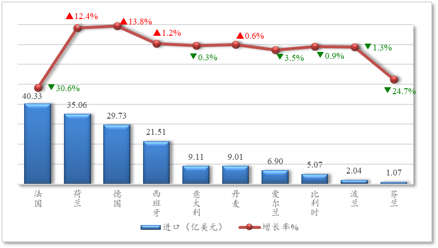 2025年,在进口前十大来源地中,法国占比最高为24.4%,但进口额同比大幅下降30.6%;荷兰和德国分别以21.2%和18%的占比位列二、三位,同比分别增长12.4%和13.8%。此外,西班牙和丹麦进口额同比分别微增1.2%和0.6%;芬兰大幅下降24.7%,爱尔兰、波兰、比利时、意大利均有不同程度下降。