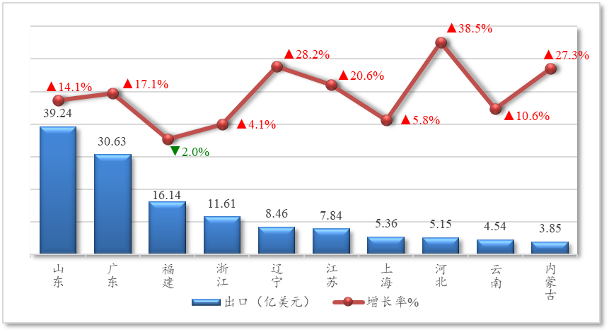 图5 我国农产品前10位出口省市出口额及同比
