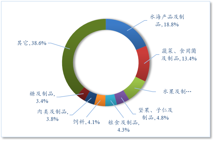 前2个月,在出口的主要大类产品中,坚果子仁及制品、肉类及制品、粮食及制品等产品出口增速较高,同比分别增长37.6%、33.4%和26.8%。水果及制品、饲料、糖及制品出口也实现两位数增长。蔬菜食用菌及制品出口同比下降4.9%,是主要产品中唯一负增长的类别。从占比看,水海产品及制品和蔬菜食用菌及制品仍为出口主力,分别占农产品出口总额的18.8%和13.4%。
