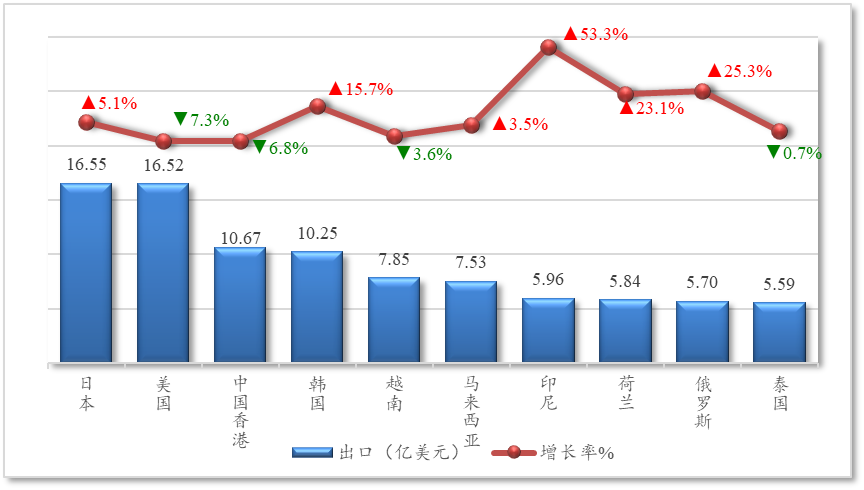 图4 我国农产品前10位出口市场出口额及同比
