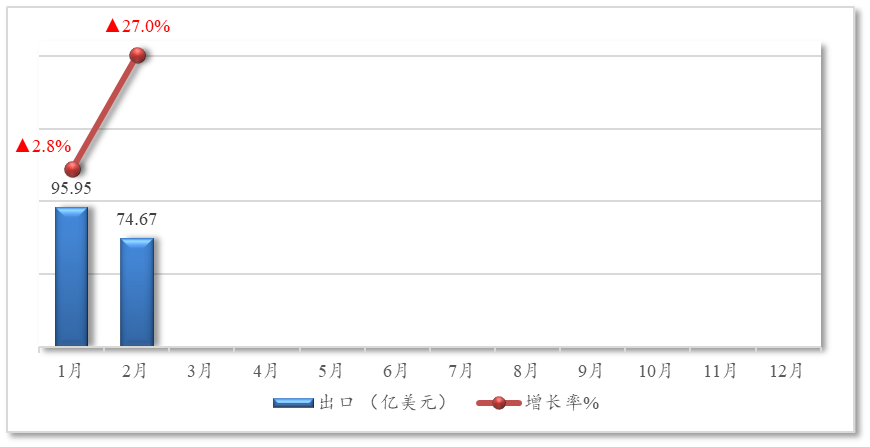 从月度数据看,1月出口同比增长2.8%,2月出口同比增长27%, 2月增速明显加快。