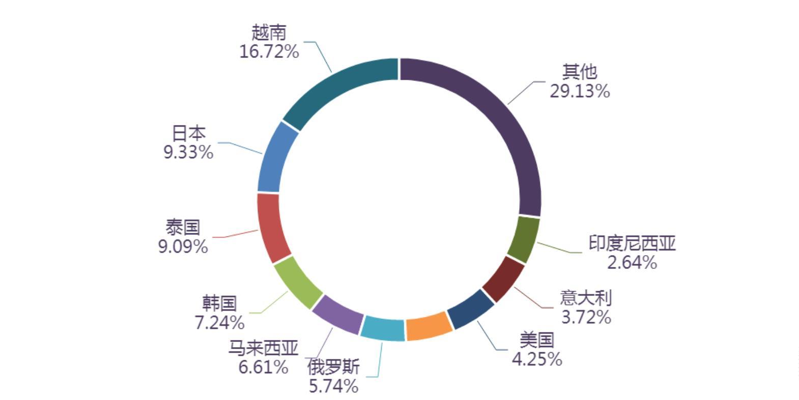 前 9个月,越南是我国食用菌及制品出口最主要的市场,出口额为 2.27亿美元,同比下降 37.68%。9月当月,出口额为 0.23亿美元,同比下降 35.45%。