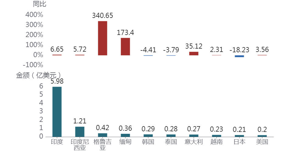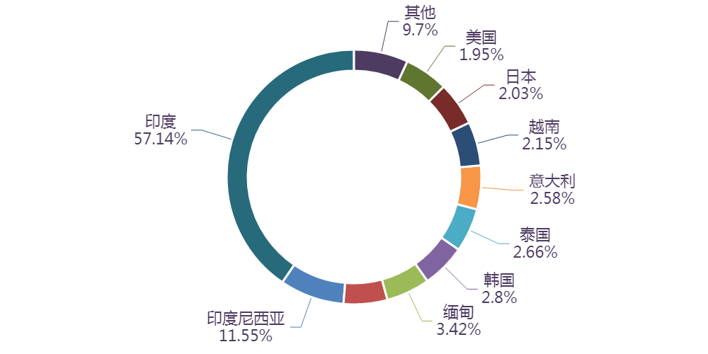 前10个月,印度是我国调味品及调味香料进口最主要的市场,进口额为5.98亿美元,同比增长6.65%。10月当月,进口额为0.31亿美元,同比增长42.62%。