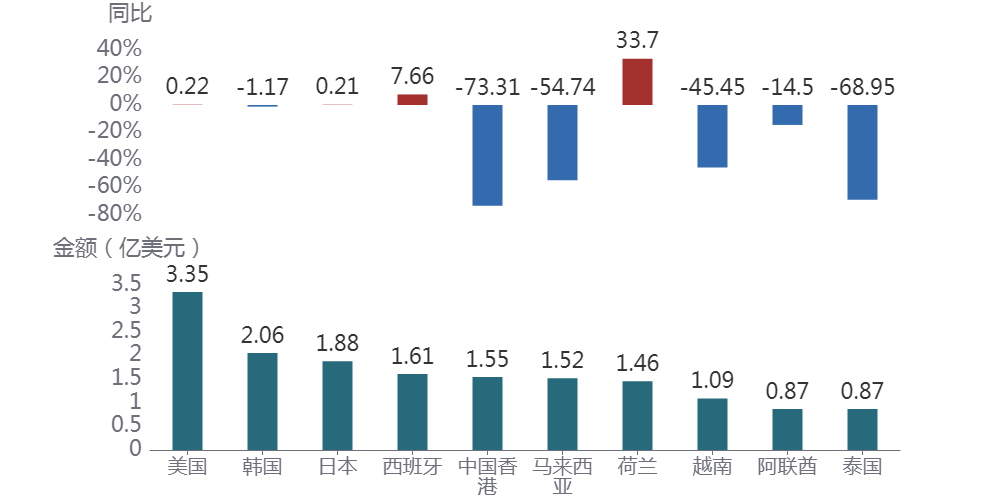 前10个月,美国是我国调味品及调味香料出口最主要的市场,出口额为3.35亿美元,同比增长0.22%。10月当月,出口额为0.34亿美元,同比增长1.92%。