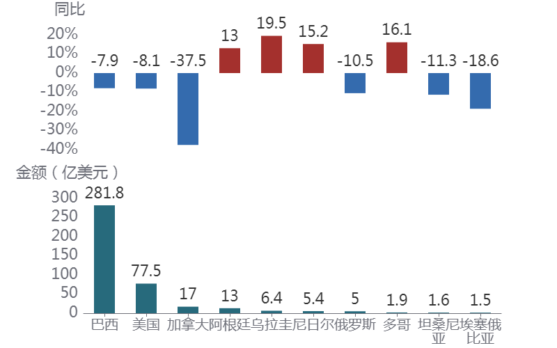 前9个月,巴西是我国油籽油料进口最主要的市场,进口额为281.8亿美元,同比下降7.9%。9月当月,进口额为49.5亿美元,同比增长21.9%。
