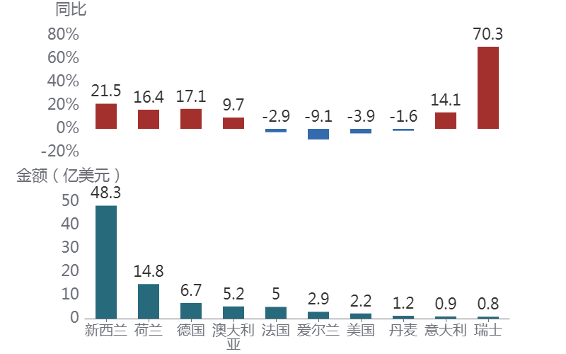 前9个月,新西兰是我国乳制品进口最主要的市场,进口额为48.3亿美元,同比增长21.5%。9月当月,进口额为4.1亿美元,同比增长14.8%。