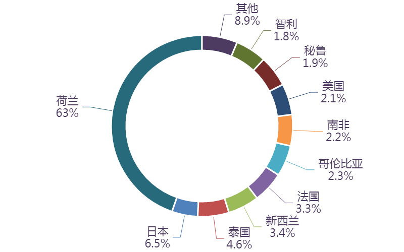 前9个月,荷兰是我国花卉植物进口最主要的市场,进口额为1.3亿美元,同比增长19.9%。9月当月,进口额为0.3亿美元,同比增长45.3%。