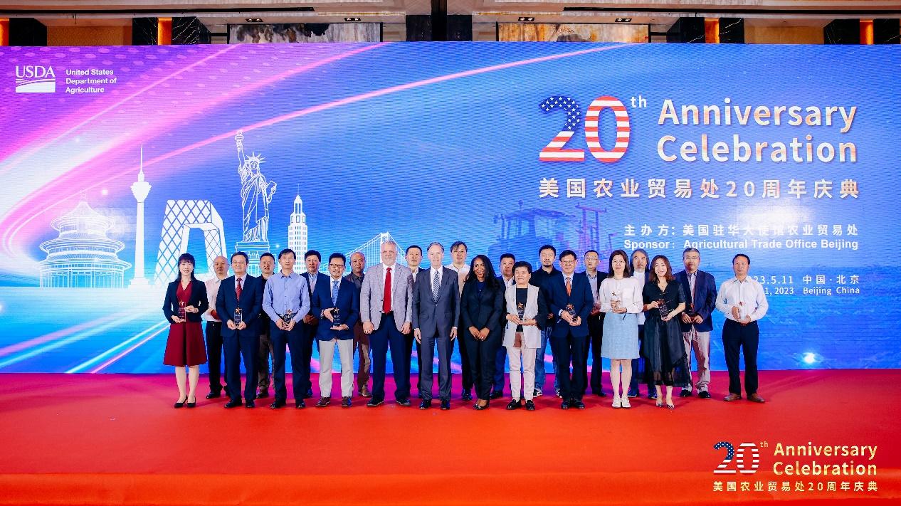 2023年5月11日,美国驻华大使馆农业贸易处(ATO Beijing,简称“美国农贸处”)举办20周年庆典活动。会上,我会荣获“最佳合作伙伴”称号。美国驻华大使尼古拉斯·伯恩斯为我会颁奖,徐小虎副会长代表我会领奖。
