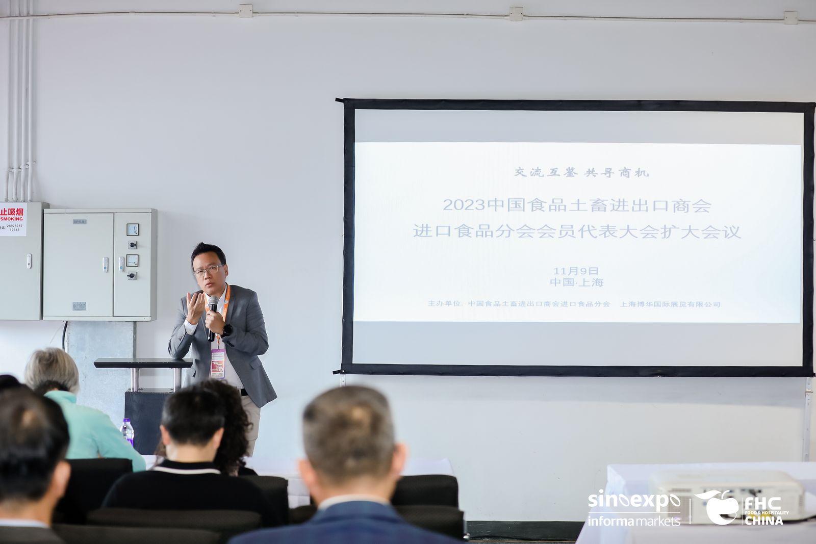 11月9日上午,中国食品土畜进出口商会进口食品分会会员代表大会扩大会议在FHC上海环球食品展同期顺利召开,本次会议以“交流互鉴,共寻商机”为主题,来自进口食品分会理事长单位、副理事长单位、理事单位、俄罗斯出口中心和意大利对外贸易委员会的代表,以及其他会员和食品行业企业及机构代表共60余人出席了本次会议。
