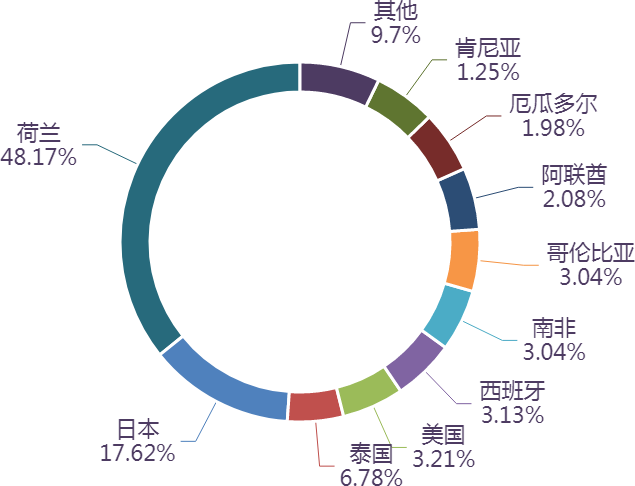 市场方面,前4个月,我国花卉植物进口额排名前十的国家/地区分别为荷兰、日本、泰国、美国、西班牙、南非、哥伦比亚、阿联酋、厄瓜多尔、肯尼亚,合计占我国该产品进口额的 90.3%。