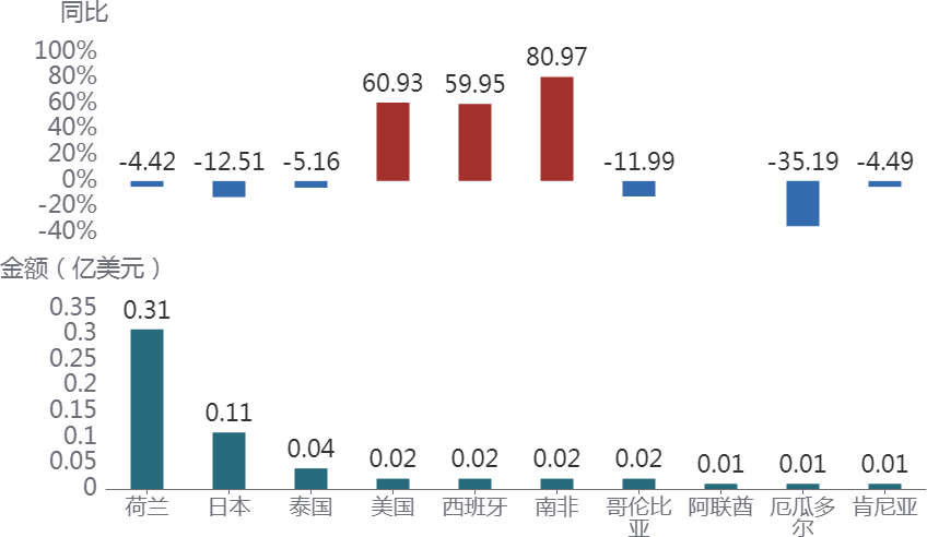 前4个月,荷兰是我国花卉植物进口最主要的市场,进口额为 0.31 亿美元,同比下降 4.42%。4月当月,进口额为 0.10 亿美元,同比下降 12.62%。