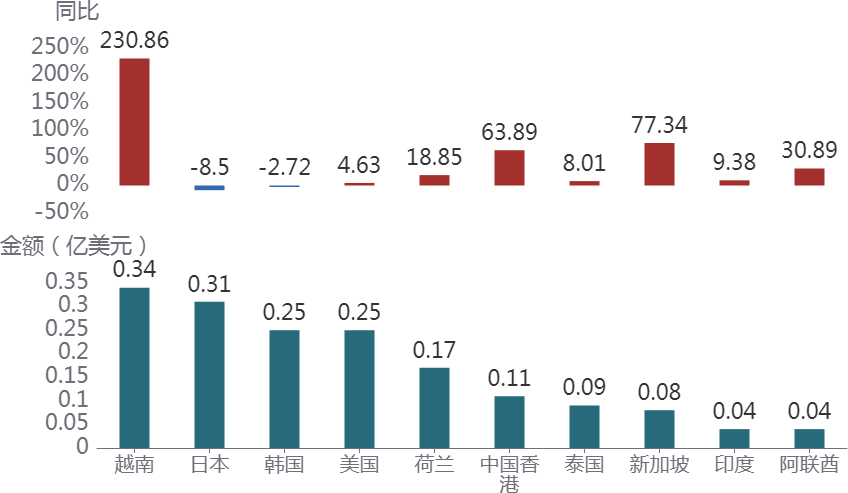 前4个月,越南是我国花卉植物出口最主要的市场,出口额为 0.34 亿美元,同比增长 230.86%。4月当月,出口额为 0.05 亿美元,同比增长 108.85%。