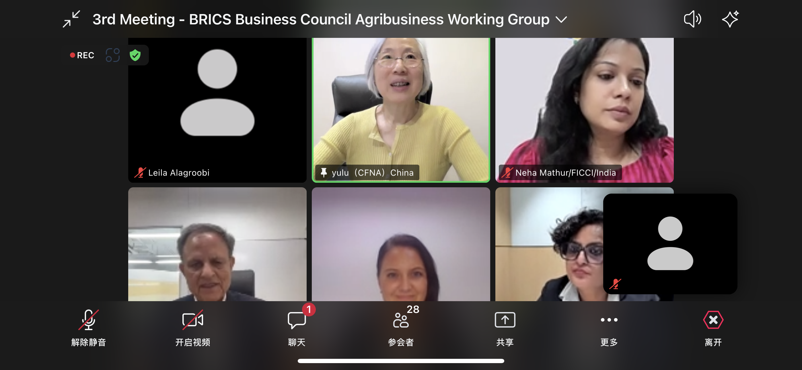 3月26日晚,于露副会长出席金砖国家工商理事会农业经济工作组第三次会议,就相关重点议题提出建议。