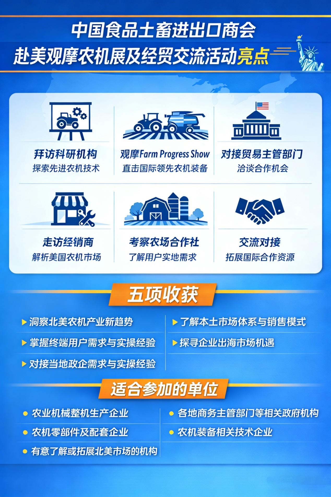 为深入落实中美省州经贸合作机制,进一步拓展我国与美国相关州在农业机械领域的务实合作,推动我国农机产业国际化发展,提升企业对国际先进技术、市场体系及应用场景的认知水平,助力企业开拓北美市场、对接优质资源,根据中国省与美国艾奥瓦州贸易投资合作联合工作组(以下简称“中艾工作组”)年度重点工作安排,中国食品土畜进出口商会(中艾工作组秘书处)拟于2026年9月初组织有关省市贸易主管部门及农机企业赴美国艾奥瓦州观摩Farm Progress Show农机展,并开展经贸交流活动。
