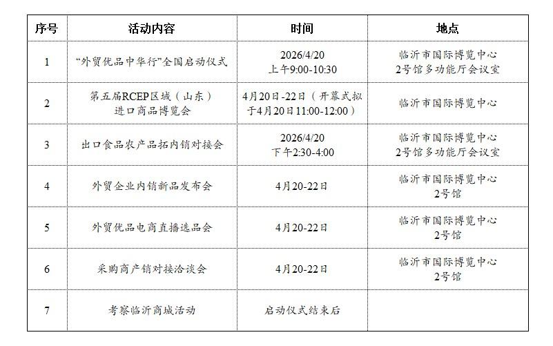 为深入推动内外贸一体化工作,促进外贸优品与国内市场的有效对接,商务部与山东省人民政府拟于4月20日(星期一)上午在山东省临沂市国际博览中心共同举办2026年“外贸优品中华行”全国启动仪式。同期,将于4月20-22日在临沂市举办第五届RCEP区域(山东)进口商品博览会、出口食品农产品拓内销对接会、外贸企业内销新品发布会、外贸优品电商直播选品会、商务洽谈等系列活动。