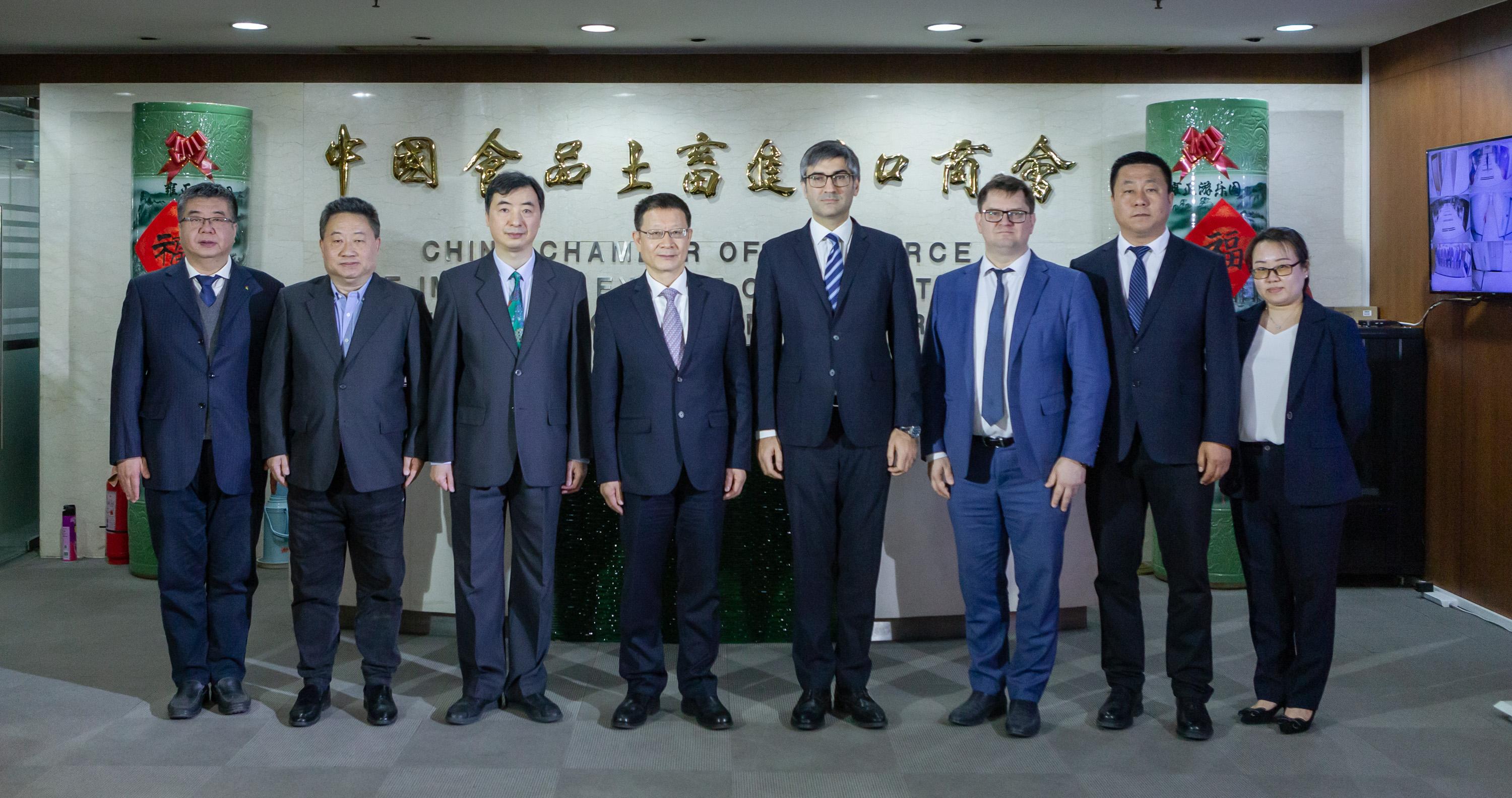 2023年4月14日上午,曹德荣会长会见了俄罗斯华诺俄翔(北京)贸易有限公司阿尔乔姆·沙罗夫董事长一行,双方就食品农产品贸易合作进行了交流。会后双方共同签署了战略合作协议。