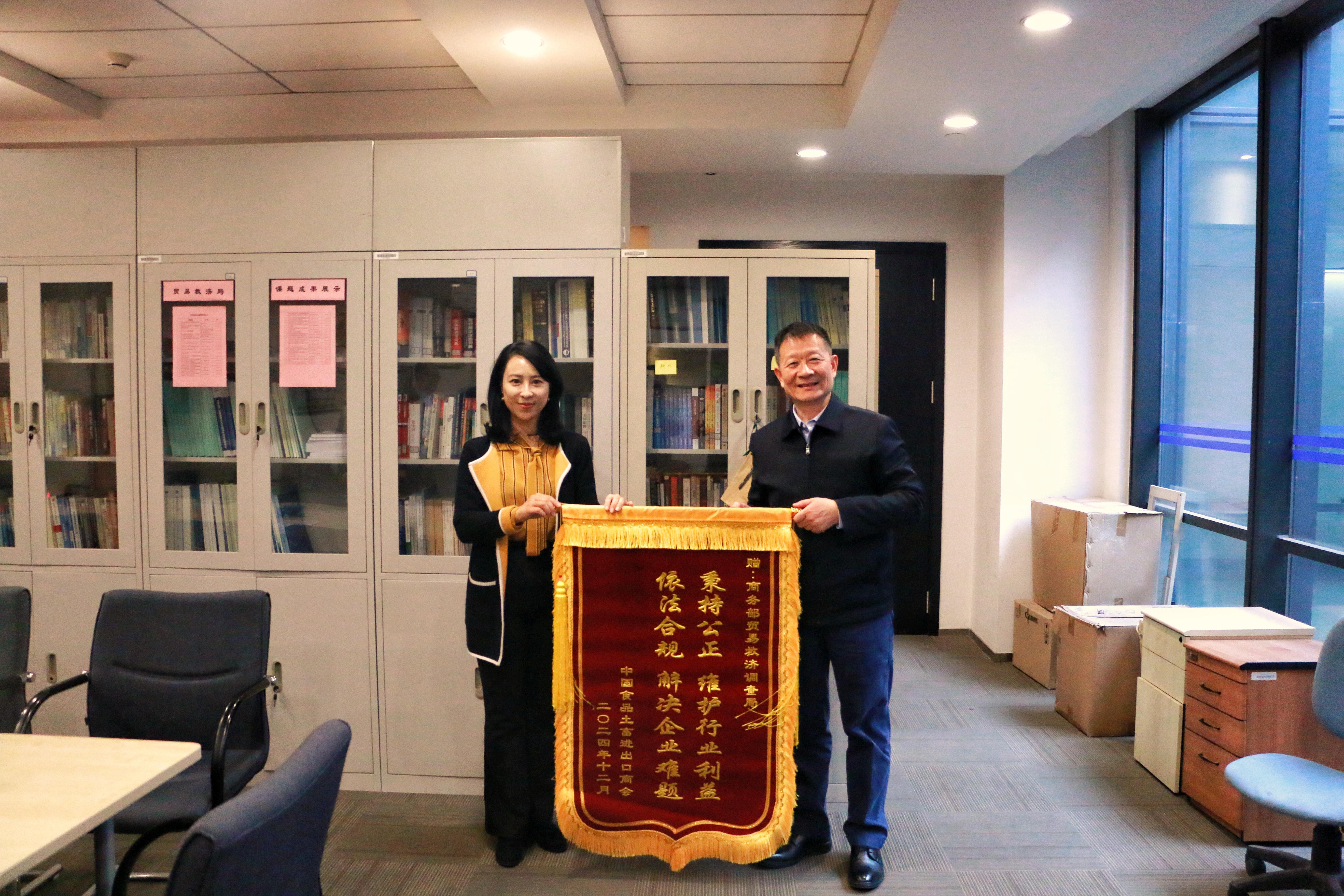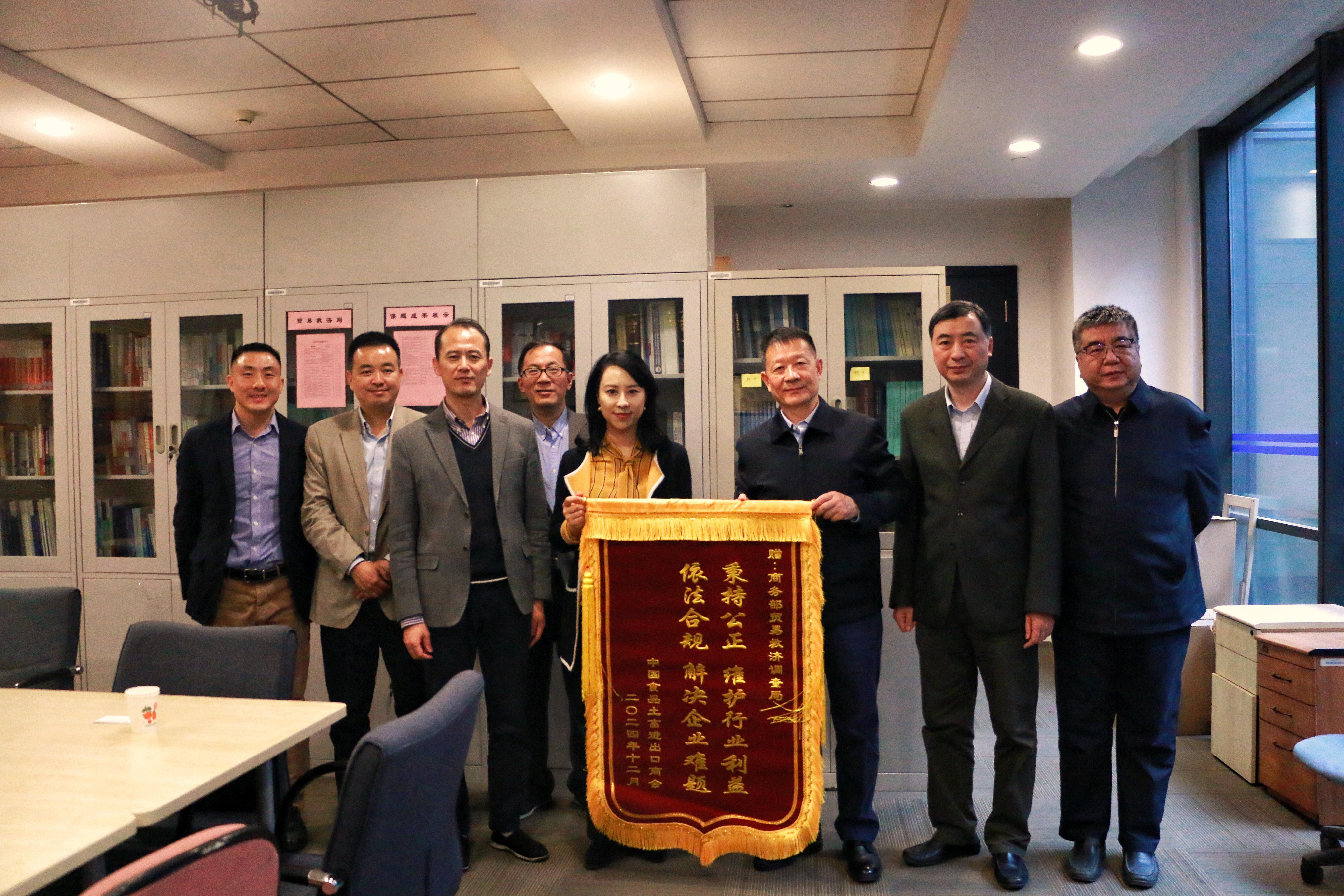 曹德荣会长代表商会和食品农产品贸易行业向贸易救济调查局赠送了锦旗。